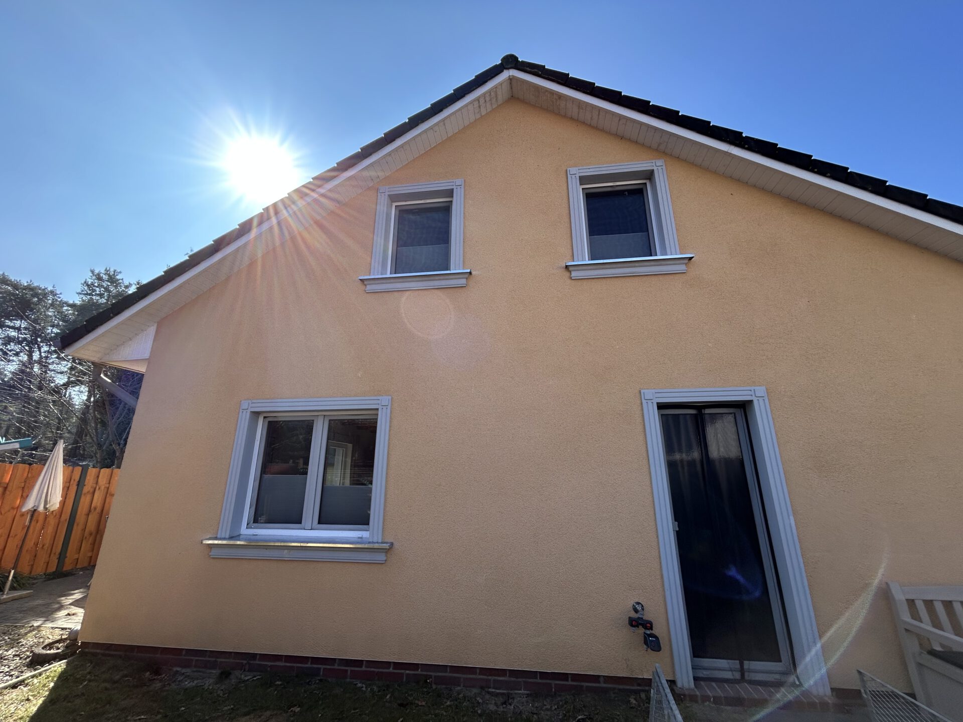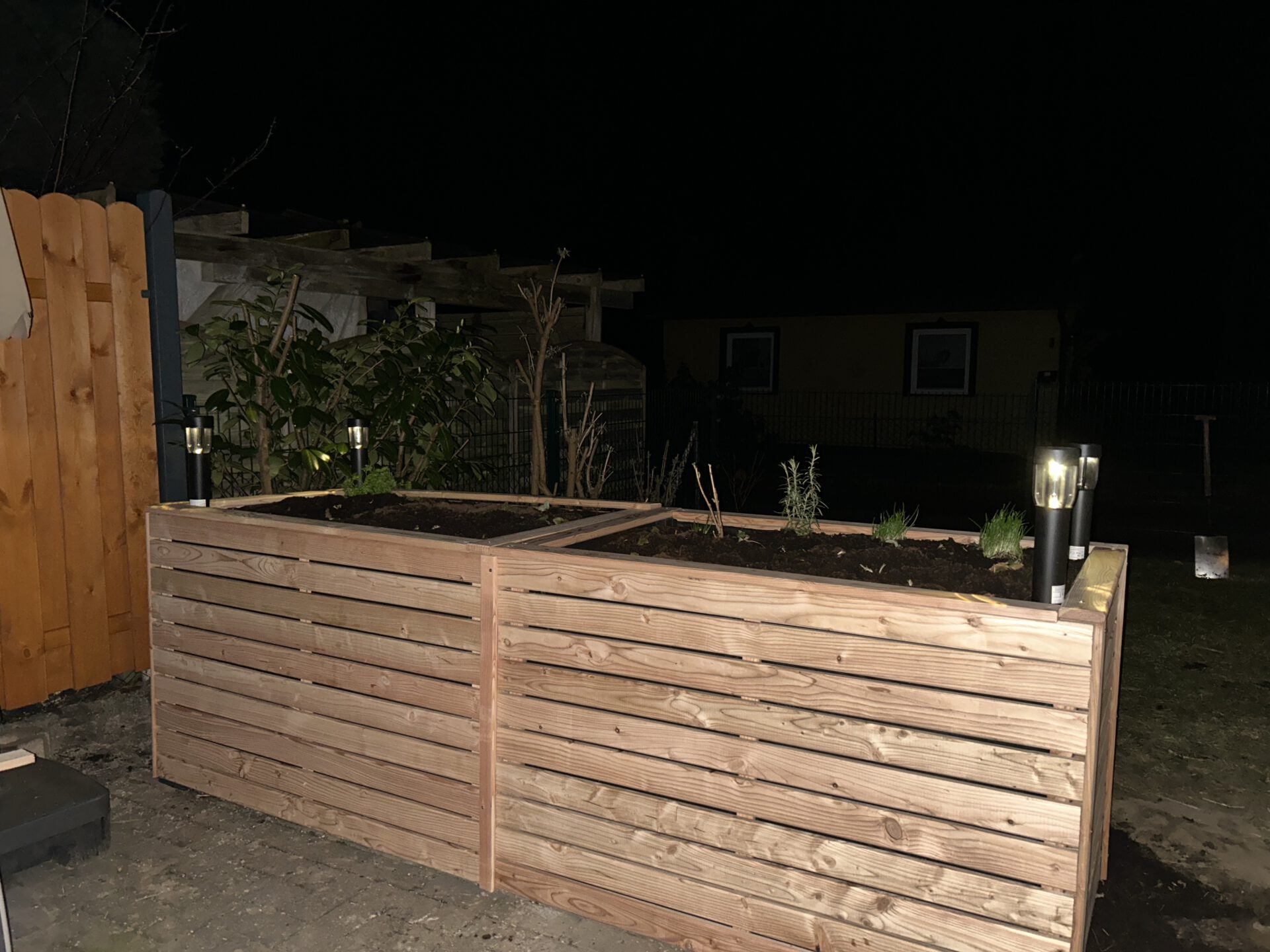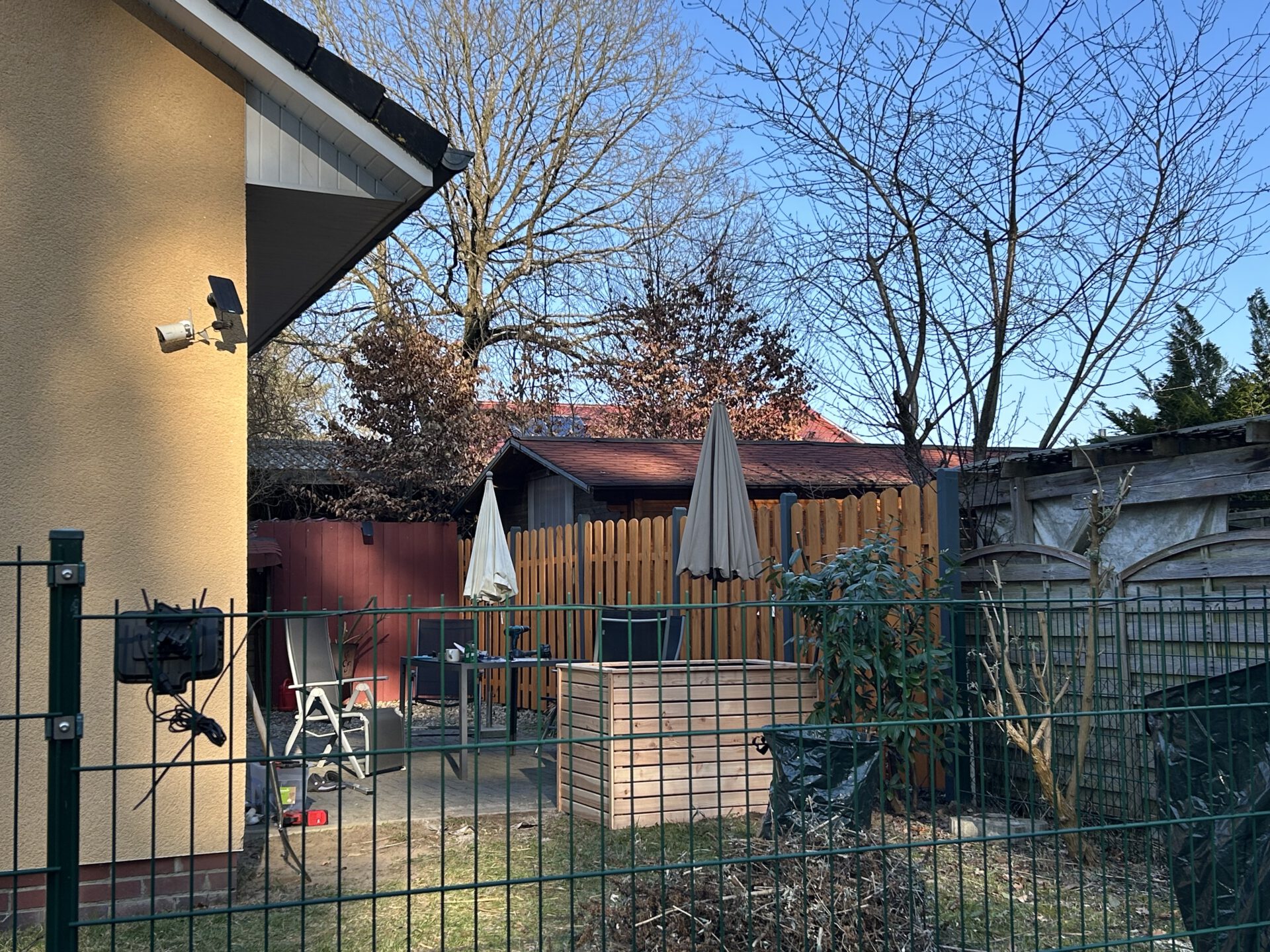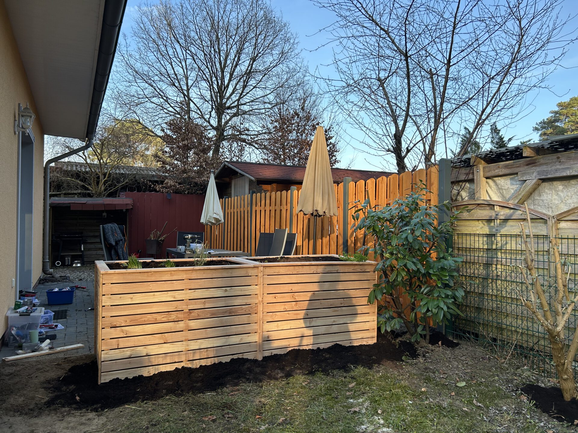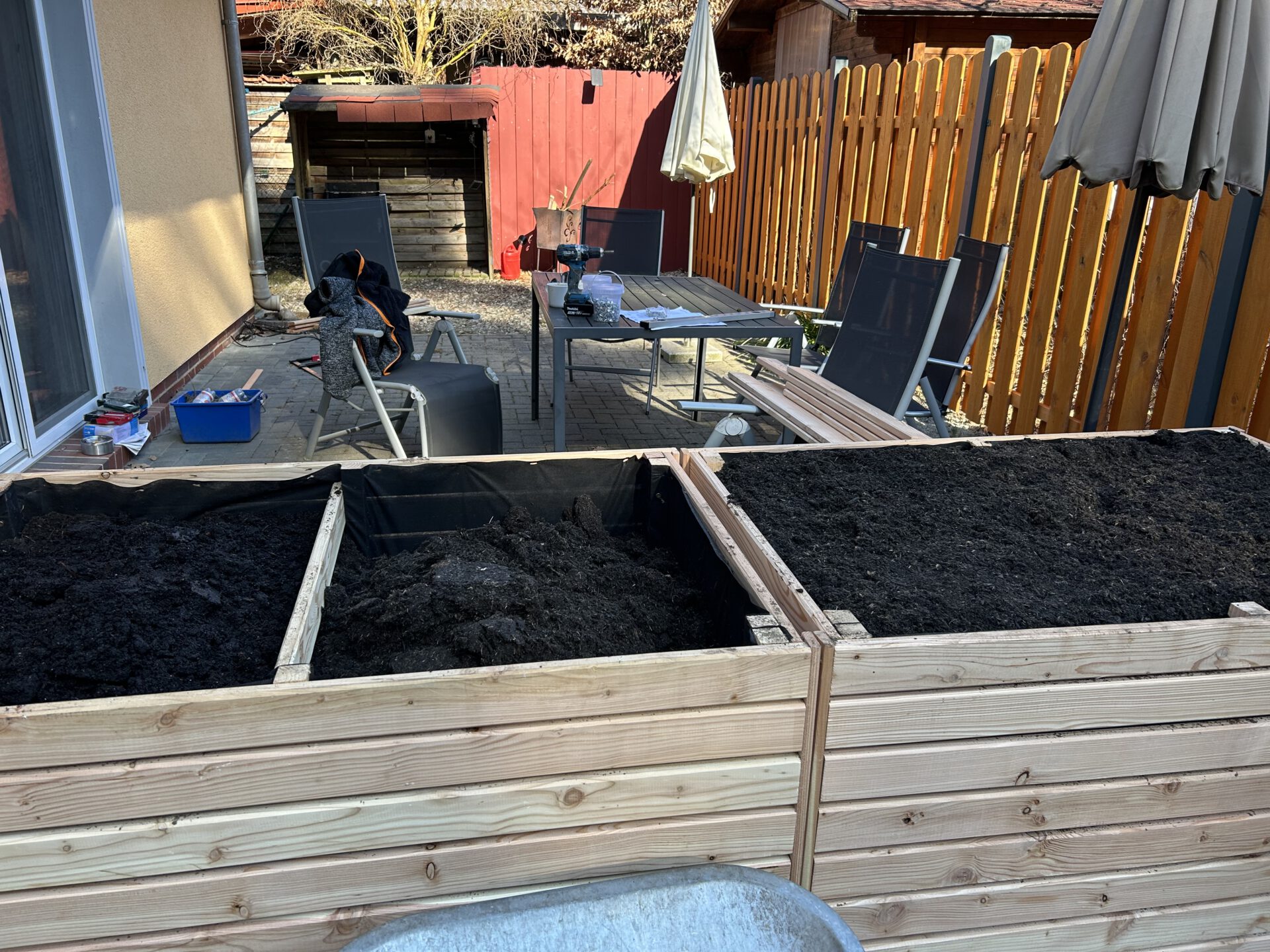 Den alten Lamellenzaun habe ich ersetzt, die Pfosten gestrichen und 2 Hochbeete gebaut und gefüllt. Im Haus sind neue Jalousien an fast allen Fenstern.