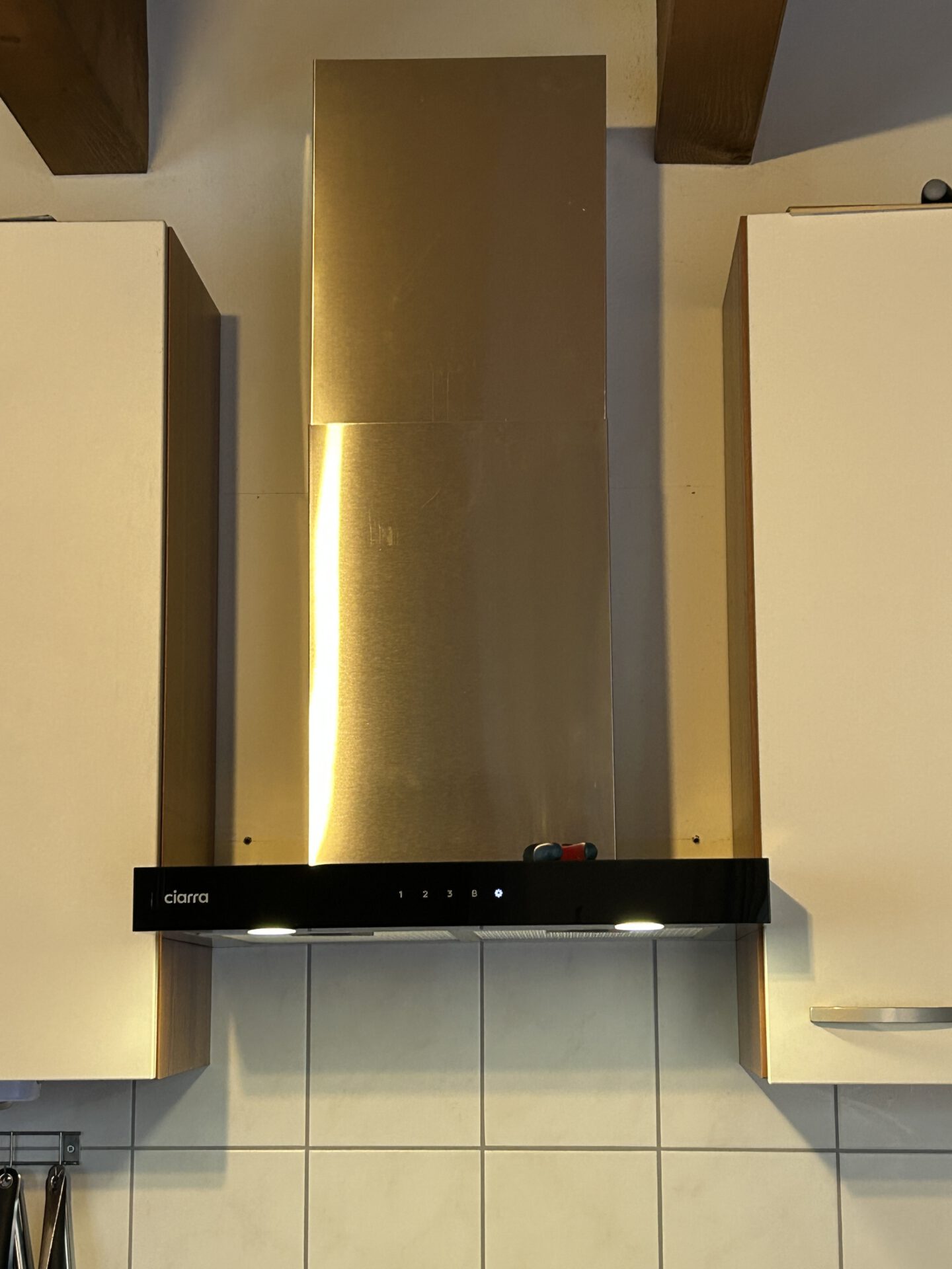 Für die Gäste, die schon mal im Haus waren – auf der neuen Abzugshaube ist kein Platz mehr für Toaster und Kaffeemaschine / Senseo. Die habe ich kurzer Hand in dem braunen Geschirrschrank in der Küche unten links deponiert. Aber mit der neuen Haube gibt es endlich mehr Licht am Herd. Die lässt sich sogar mit dem Tablet steuern.